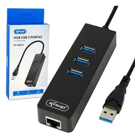O produto conta com três portas para conexão de periféricos e uma interface dedicada para rede, permitindo a utilização simultânea de acessórios e conexão à rede conforme a compatibilidade do dispositivo principal.
